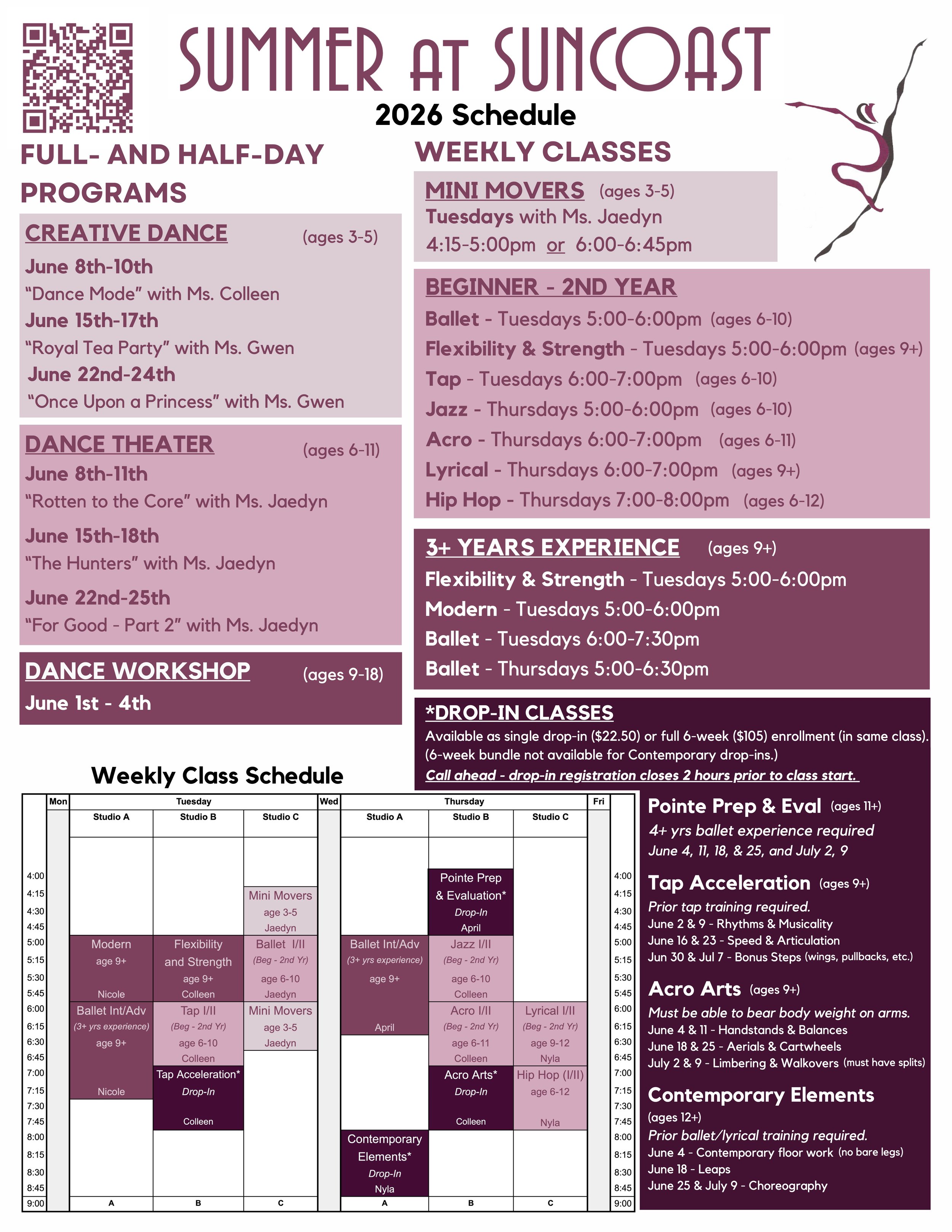 Suncoast Academy of Dance offers several different summer dance programs to fit every dancerβs needs. We offer half-day and day-long sessions, as well as classes, intensives, and conventions. Check out our summer schedule (typically available in late April) to find the program that best fits your dancers. Currently registered students will receive the Summer Schedule via email when it becomes available. If you are not currently registered, and would like information when our summer schedule becomes available, please email us.